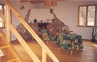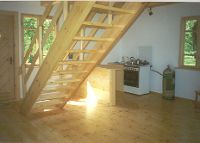 přízemí: obývací pokoj s kuchyňským koutem - mikrovlnná trouba, lednička, kávovar, krb.